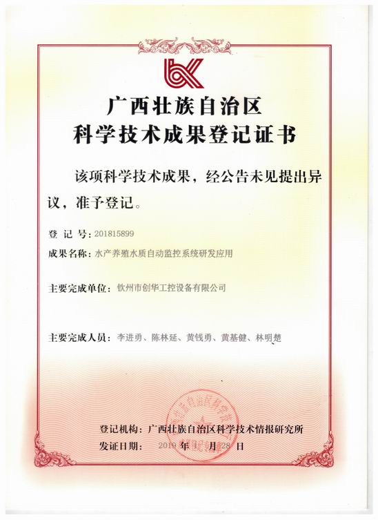 欽州市創(chuàng)華工控設(shè)備有限公司自研項(xiàng)目《水產(chǎn)養(yǎng)殖水質(zhì)自動(dòng)監(jiān)控系統(tǒng)研發(fā)應(yīng)用》喜獲成果登記。